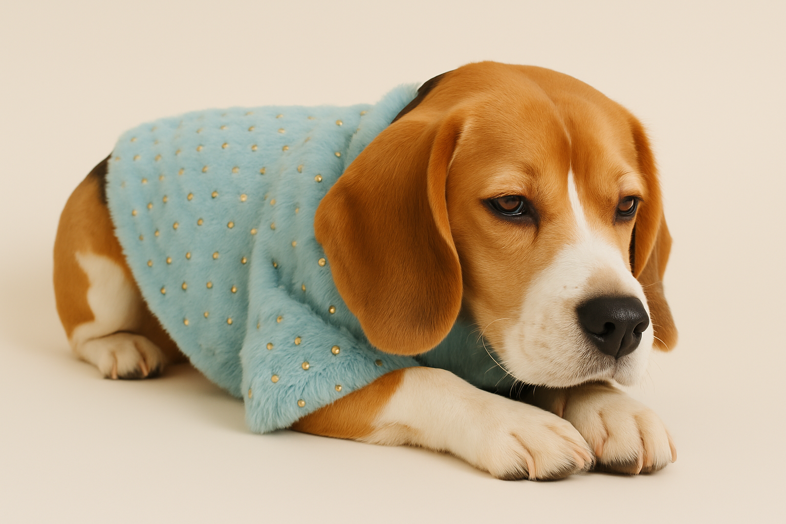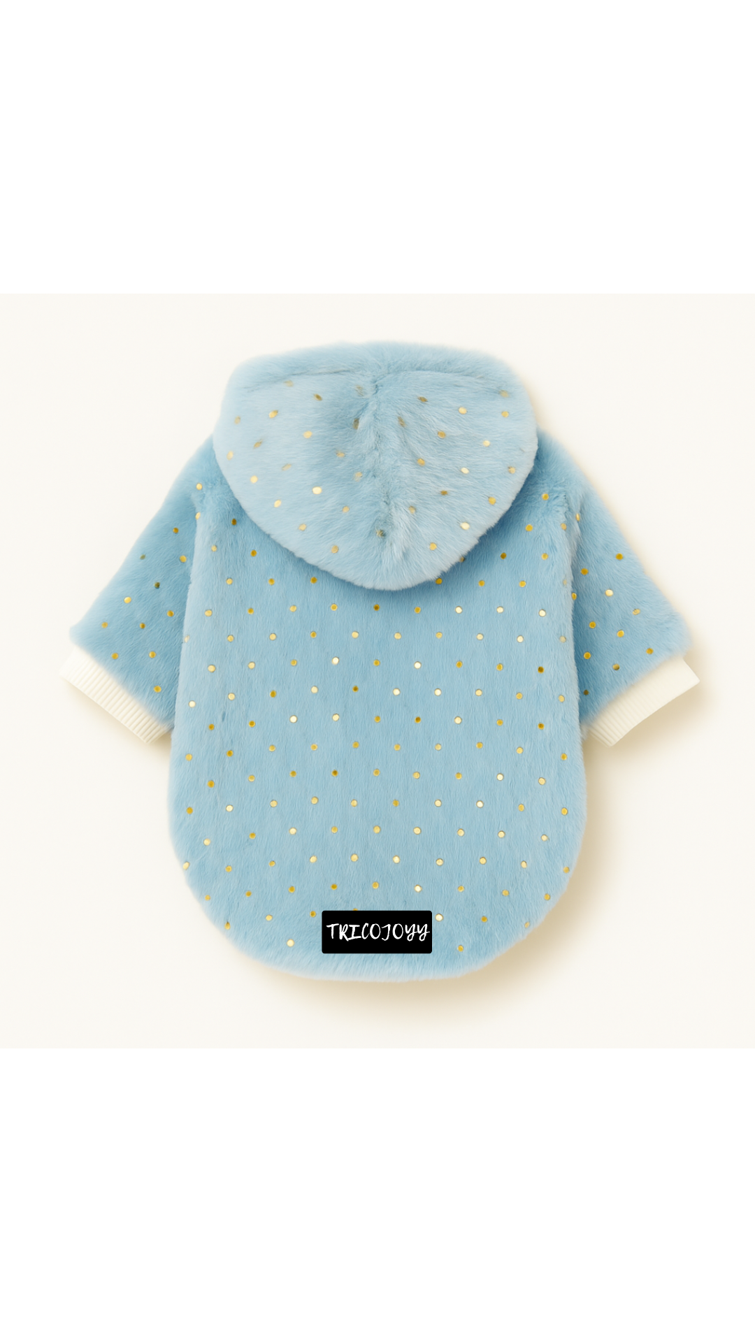 The Starlit Snuggle Fur Jacket is designed to keep your pet cosy in cooler weather. Made with soft faux fur in a pastel blue shade and dotted with golden hearts, it’s warm, comfortable, and easy to wear. A practical pick for winter days while adding a touch of fun to your pet’s look.